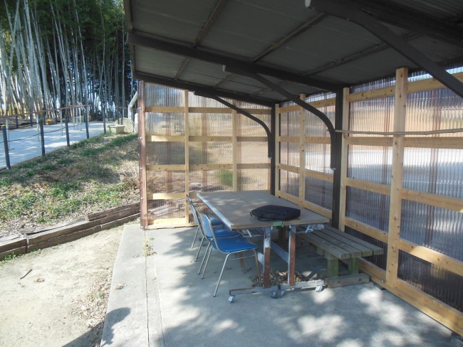 その対策になるかどうか、雨を防げる小さな囲いを造った。ここにキャビネットを置き、亀三郎関係の資料や市内の観光案内パンフレットなどを置く。「来場芳名記帳」も置いてみたい。